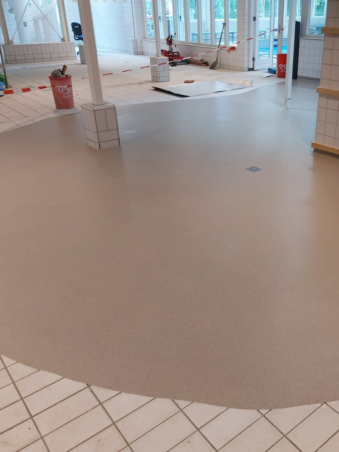 Tijdens renovatie hebben wij in Urk bij zwembad ’t Bun de vloer rondom het zwembad en de bedrijfskeuken vernieuwd. De opdrachtgever wilde bij het zwembad de uitstraling van een strand, we hebben dit kunnen maken door middel van een naadloze troffelvloer in een zandkleurige mortel.